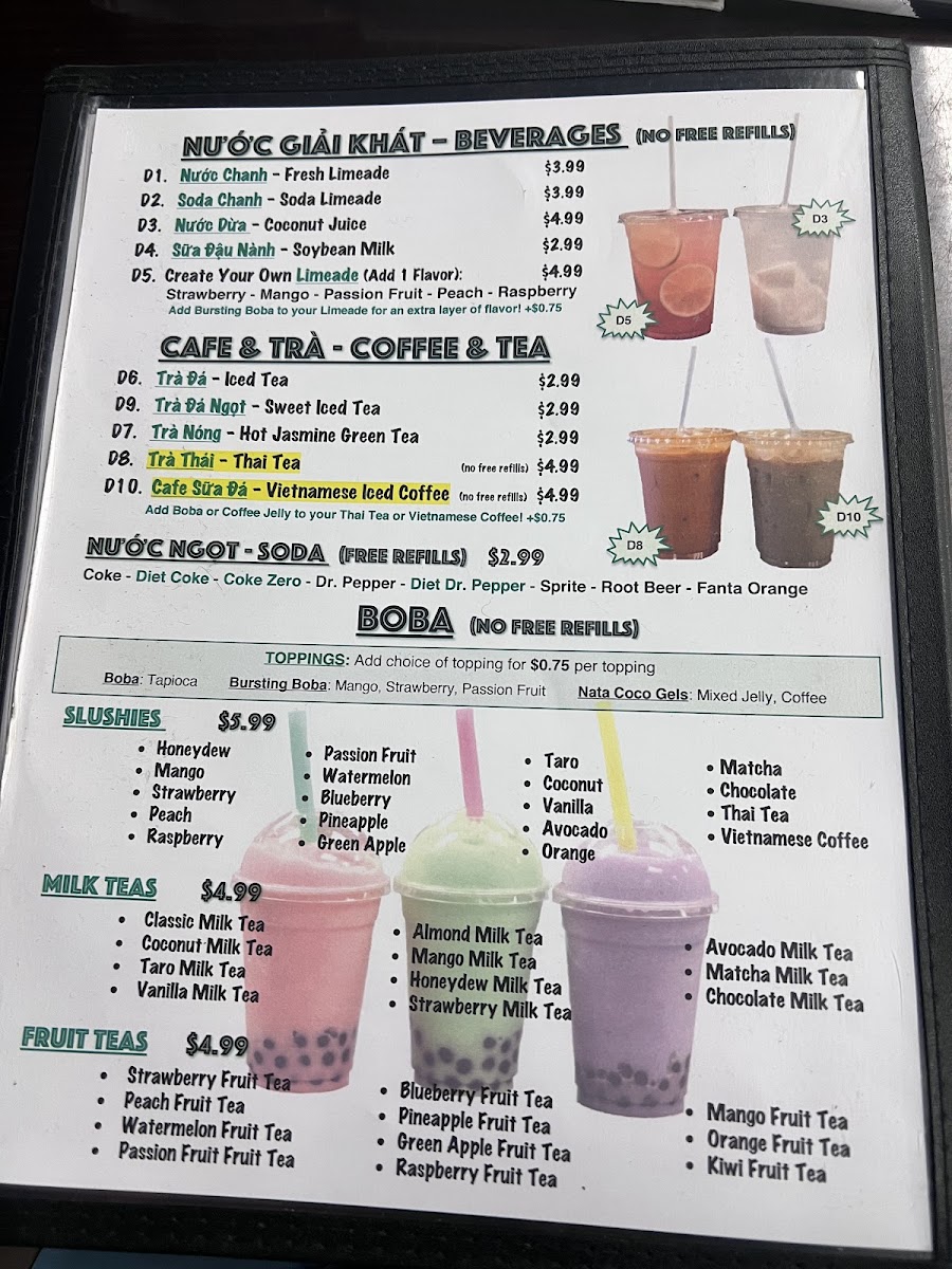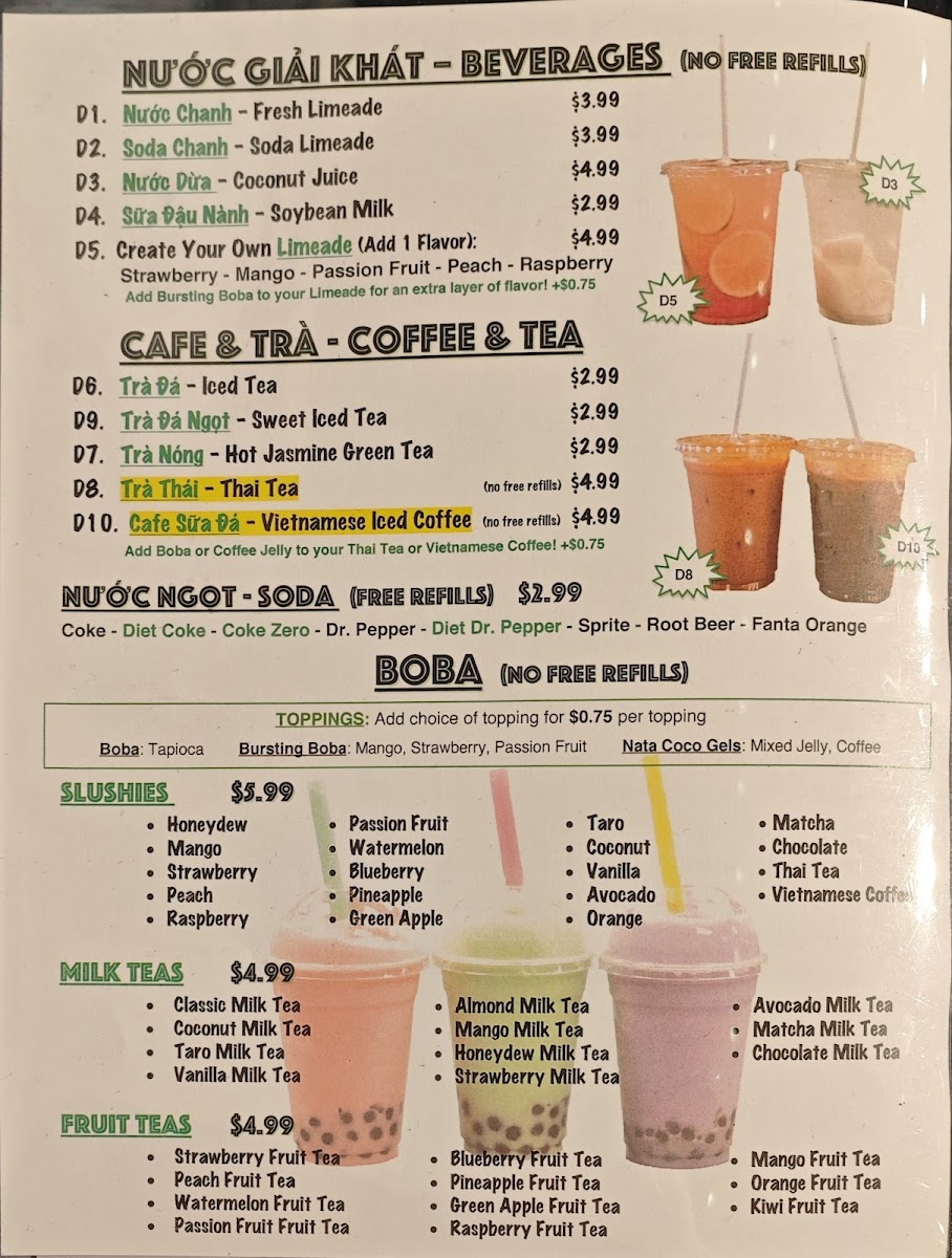 The menu at Phở Nhi Vietnamese Noodle House offers a straightforward yet satisfying selection of Vietnamese favorites, inviting guests to enjoy casual and comforting meals. Whether you're stopping by for a warm bowl of pho or a refreshing coconut boba tea, the menu balances traditional dishes with approachable flavors in a relaxed setting.